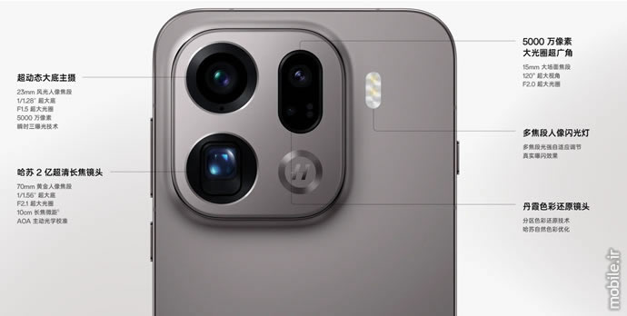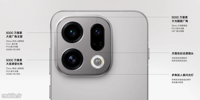 در Find X9 نیز با دوربین اصلی 50 مگاپیکسلی بهتری روبرو میشویم که حسگر 1/1.4 اینچ آن بزرگتر شده، لنز 7 مرحلهای آن یک جزء بیشتر دارد، دیافراگم آن دو پله بازتر شده و به f/1.6 رسیده و مکانیزم لرزهگیر اپتیکال یا OIS آن نیز بهجای دو محوره، چهار محوره است. دوربین 50 مگاپیگسلی با لنز اولتراواید f/2.0 مجهز به فوکوس خودکار در این گوشی تغییری نکرده و دوربین 50 مگاپیکسلی با لنز 73 میلیمتری تلهفتوی f/2.6 OIS نیز بهقرار سابق است با این تفاوت که مکانیزم لرزهگیری این دوربین نیز بهجای دو محور در چهار محور انجام وظیفه میکند.
