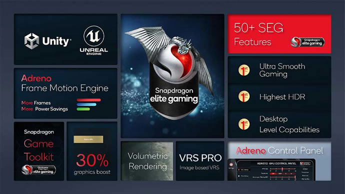 کوالکام در این قسمت از ویژگیهای جدید Elite Gaming مرتبط با بازی سخن به میان آورده که یکی از آنها دست توسعهدهندهگان را در ایجاد تعادل مابین عملکرد و مصرف انرژی باز گذاشته، دیگری با نام Adreno Frame Motion Engine امکان رندر کردن بازیها با دو برابر نرخ فریم بیشتر با مصرف انرژی یکسان (یا حفظ فریم در ثانیه با نصف کردن مصرف انرژی) را فراهم میکند و Volumetric Rendering نیز تغییراتی را در افکتهای نوری در سطح «گرافیکهای دسکتاپی» بهوجود میآورد. گزینه Variable Rate Shading Pro یا VRS مبتنی بر تصویر دیگر نکته جدید این قسمت است که با هدف تلفیق این قابلیت در بازیهای بیشتر طراحی شده است.