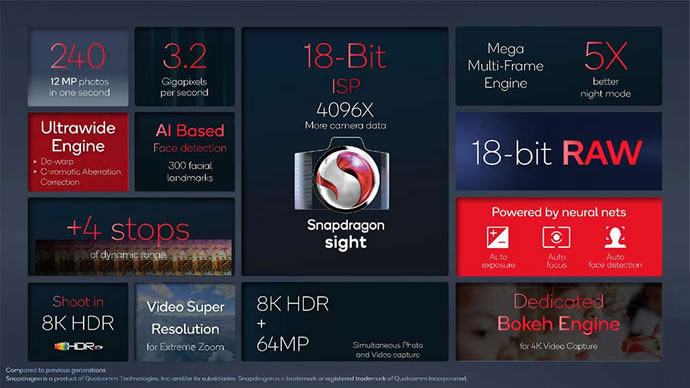 پروسسور سیگنال تصویری جدید کوالکامهمچنان یک سیستم ISP سهگانه محسوب میشود که 4,096 بار اطلاعات دوربین بیشتری را دریافت کرده و چهار پله اضافی طیف دینامیکی فعال (dynamic range) برای پوشش قسمتهای بسیار روشن تا بسیار تیره دارد. این ISP میتواند پس از برداشت 240 عکس 12 مگاپیکسلی آنها را در یک تصویر با عمق بیت متفاوت تلفیق کند و بهلطف توان خروجی 3.2 گیگاپیکسلی، همزمان با برداشت ویدئوی HDR با وضوح 8K، عکسهای 64 مگاپیکسلی نیز برداشت کند.
