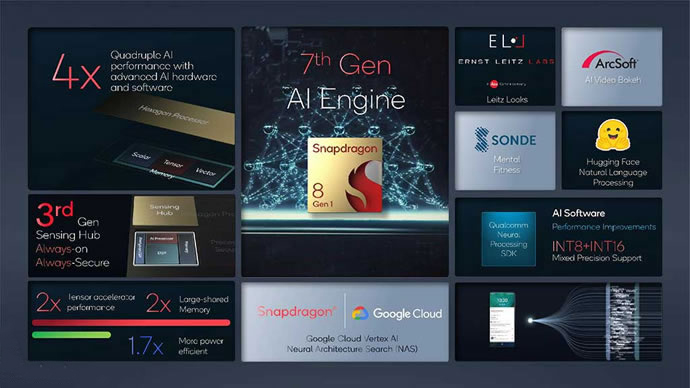 کوالکام این بار بر خلاف Snapdragon 888 و +Snapdragon 888 که بهترتیب از 26 و 32 تریلیون عملیات در هر ثانیه (TOPS) پشتیبانی میکردند به رقم TOPS چیپست جدید خود اشارهای نکرده و از دو برابر شدن توان خروجی تنسور و رقمهای افزایشی کمتری برای محاسبات عددی و برداری سخن گفته است. کوالکام همچنین بدون اشاره به جزییات، این بلاک را 4 برابر سریعتر از نسل قبلی معرفی کرده و میزان بهبود مصرف انرژی در آن را نیز 70 درصد اعلام کرده است.