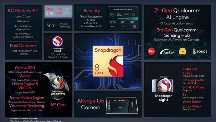 کوالکام همچنین از یک ISP چهارم در Snapdragon 8 Gen 1 استفاده کرده که برخلاف ISP سهگانه اصلی برای تغذیه دوربین همواره روشن دستگاه بهکار میرود. ایده دوربین همواره روشن که کوالکام به استقبال توسعهدهندهگان به آن امید بسیاری بسته است برای مواردی مثل خاموش کردن اتوماتیک صفحهنمایش دستگاه هنگام قرارگیری گوشی به پشت یا شناسایی افراد دیگری که به صفحهنمایش گوشی چشم دوختهاند بهکار میرود. این ایده البته بدون نگرانیهای امنیتی نیز نخواهد بود اما کوالکام با اشاره به این نکته که تمامی اطلاعات بهدست آمده از این دوربین تنها در خود گوشی ذخیره میشوند و استفاده از آن منوط به تأیید کاربران خواهد بود (درست همانند میکروفون همواره فعال برای دسترسی به امکانات دستیار هوشمند صوتی)، این ویژگی را در راستای امنیت بیشتر توصیف میکند.