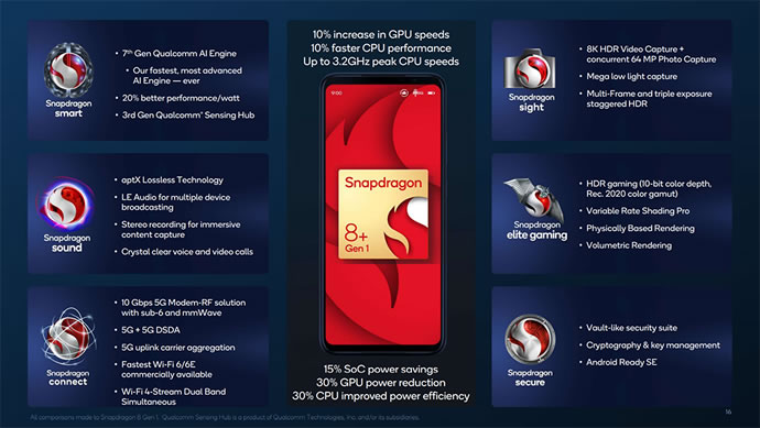 همانطور که از اسم این مدل و افزودن تنها یک پسوند پلاس به آن میتوان حدس زد، Snapdragon 8+ Gen 1 در مقایسه با همنام بدون پلاس خود از لحاظ نوع و ترکیب هستههای پردازشی و گرافیکی، واحدهای AI، مودم و دیگر قسمتهای سختافزاری با تفاوت خاصی روبرو نشده اما با ارتقاء فرکانس هستهها از یک سو و تغییر فرایند ساخت از سوی دیگر ضمن بهبود کارایی در مصرف انرژی نیز به دستاوردهای جالب توجهای رسیده است.
