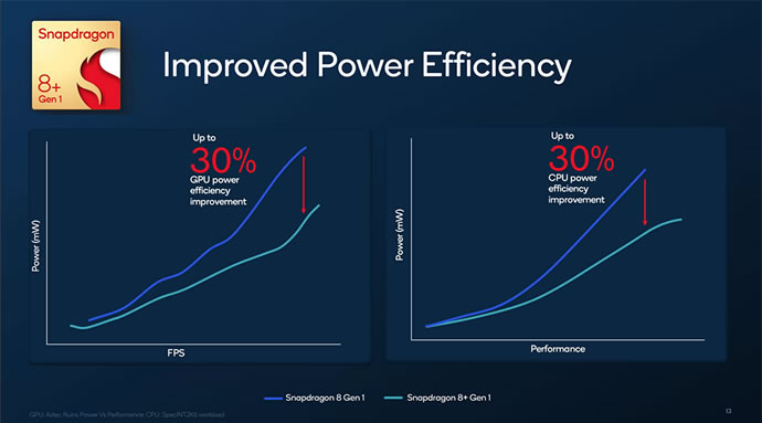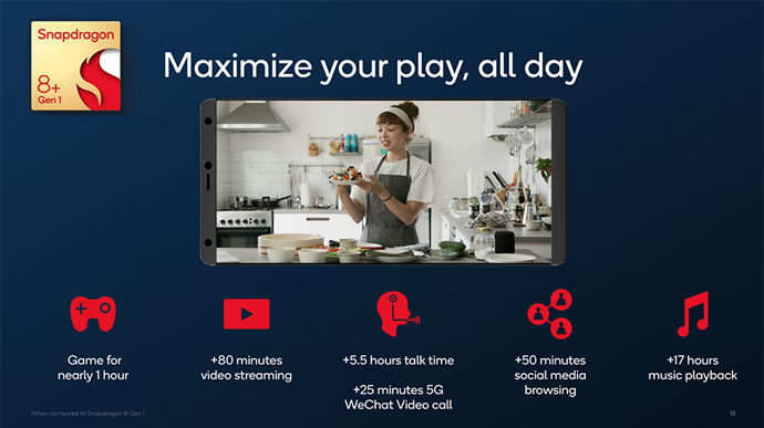 بخش هوش مصنوعی نیز با 20 درصد پرفورمنس بهازای وات بهتر روبرو شده و مودم بیسیم نیز در مصرف انرژی بهتر عمل میکند. با در کنار هم قرار دادن تمامی درصدهای صرفهجویی انرژی در بخشهای مختلف، Snapdragon 8+ Gen 1 مجموعا 15 درصد انرژی کمتری نسبت به قبل مصرف میکند که در دنیای واقعی به 1 ساعت بازی بیشتر، بیش از 80 دقیقه استریم ویدئوی طولانیتر، بیش از 5.5 ساعت مکالمه بیشتر، بیش از 50 دقیقه دوام بیشتر در شبکههای اجتماعی و بیش از 17 ساعت پخش طولانیتر موسیقی تعبیر شده است.